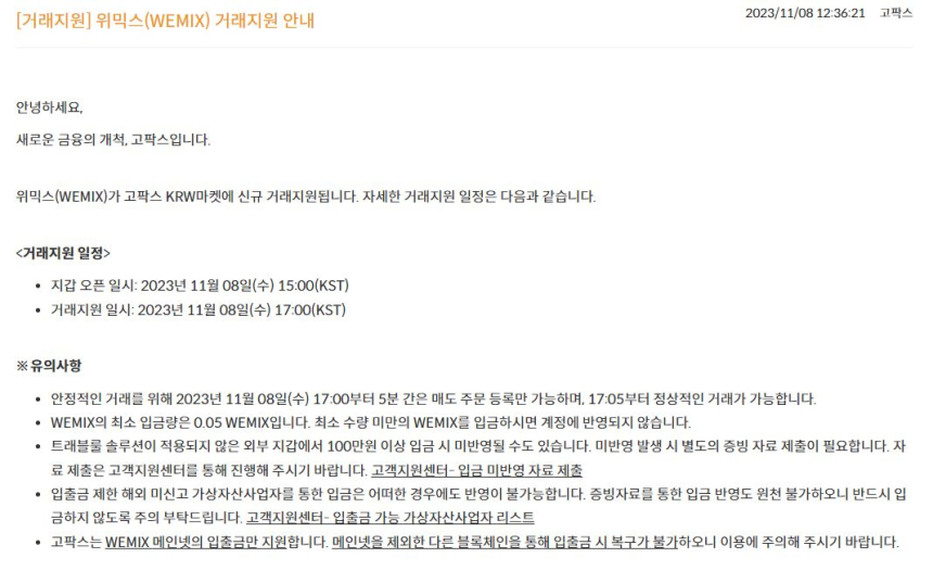 고팍스는 지난 8일 위믹스가 고팍스 KRW마켓에 신규 거래지원된다고 공지했다.