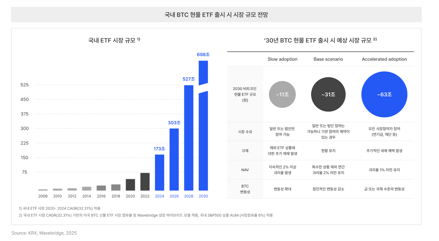 이 시장이 열리면 리테일 투자자는 지갑 관리 없이 증권계좌로 손쉽게 투자할 수 있고, 금융당국의 감독 아래 자산을 안전하게 보관할 수 있게 되어 기관 투자자들의 본격적인 참여를 촉발하는 계기가 될 수 있다. 리서치는 "현물 ETF는 단순한 투자 수단이 아니라 한국 자본시장의 제도권 확장과 디지털자산 금융화의 상징이 될 것"이라고 강조했다.