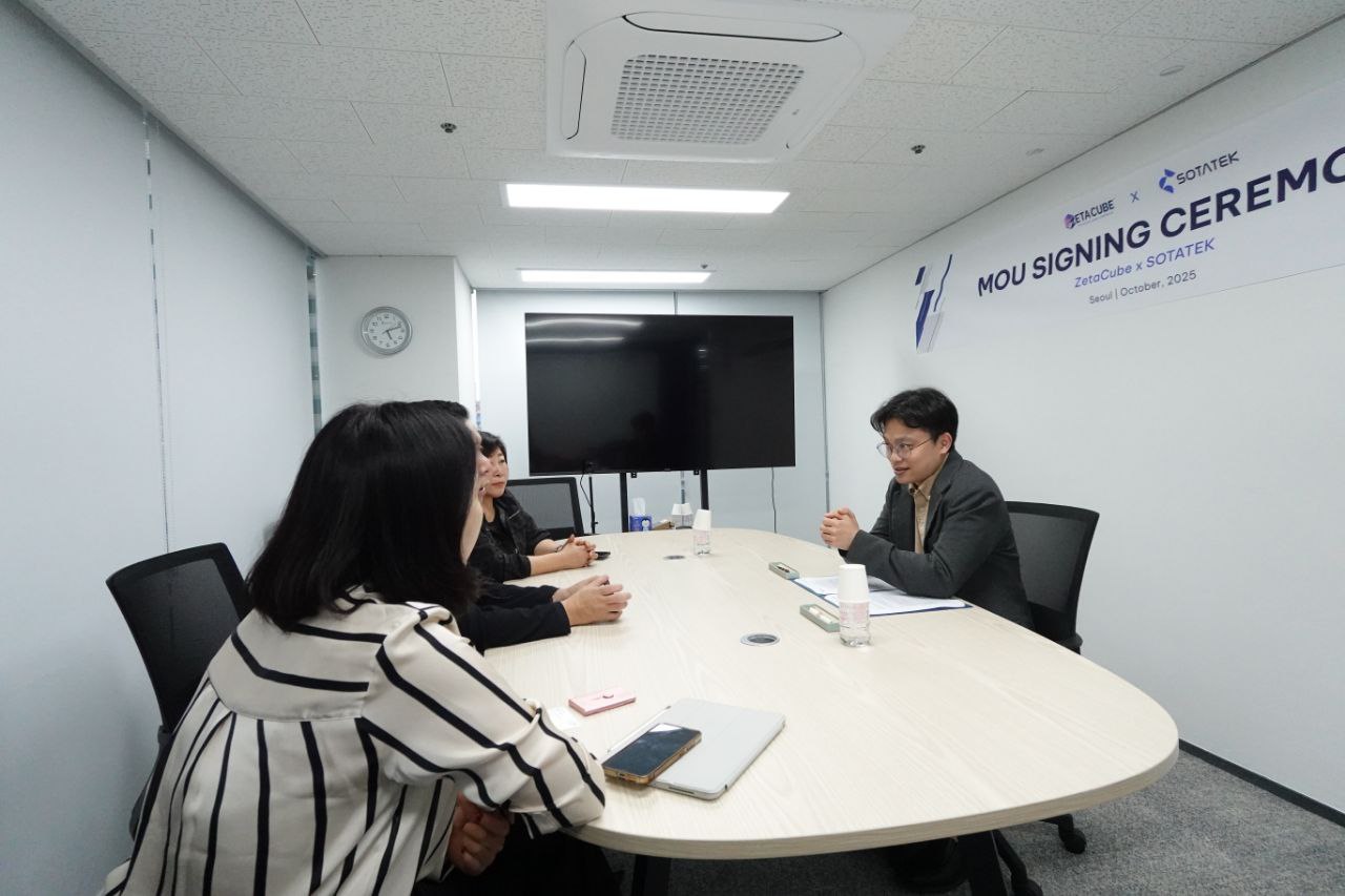 초소형 탈중앙화 데이터센터 솔루션 ‘NANODC(나노데이터센터)’를 보급 중인 제타큐브와 글로벌 대형 IT 서비스 기업 소타텍코리아(SotaTek Korea)가 인공지능(AI)과 Web3 인프라 혁신을 위한 기술 협력 양해각서(MOU)를 체결했다. 협약식은 2025년 10월 14일 서울 강남구에 위치한 소타텍코리아 본사에서 진행됐다.