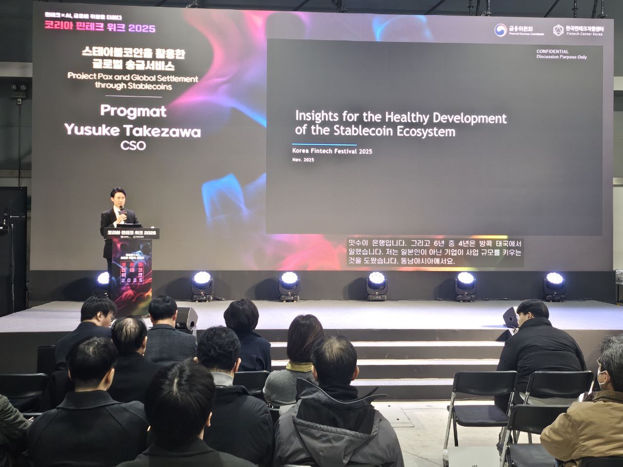 두 번째 발표에서 유스케 타케자와 (Yusuke Takezawa) Progmat CSO는 글로벌 토큰화 프로젝트 경험을 토대로 스테이블코인 인프라 구축이 직면한 과제를 분석했다.