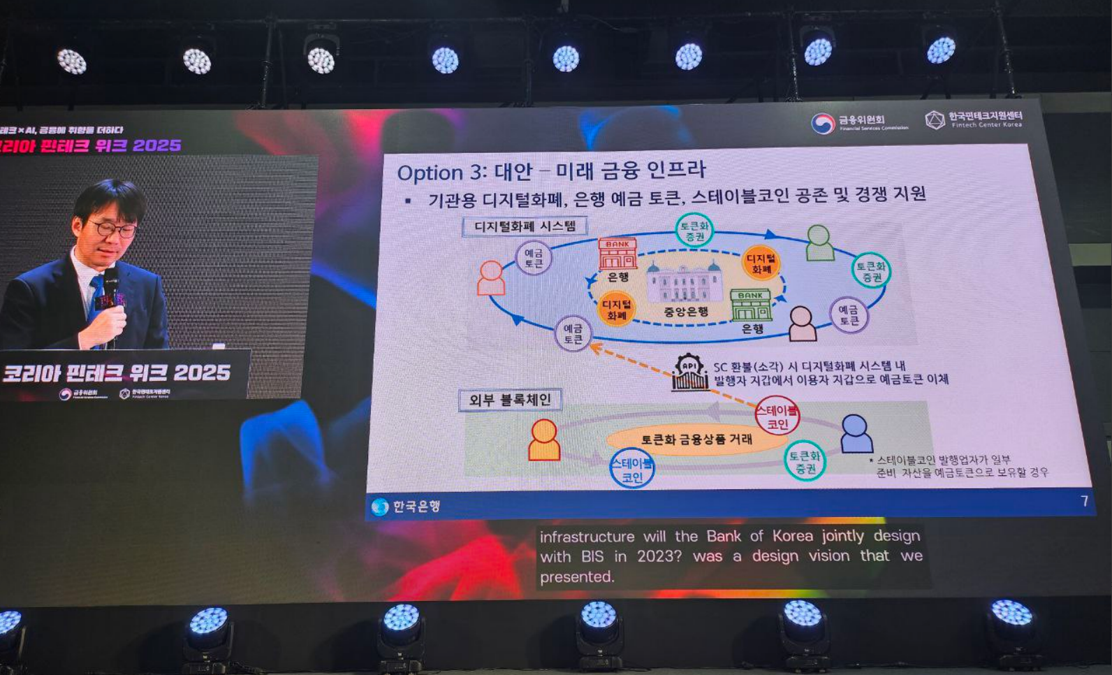 첫 발표에서 김동섭 한국은행 디지털화폐기획팀장은 한국은행이 수년간 진행해 온 CBDC 모의실험과 토큰 기반 금융 인프라 연구를 소개하며, CBDC·예금토큰·스테이블코인이 공존하는 미래 인프라 전략을 제시했다.