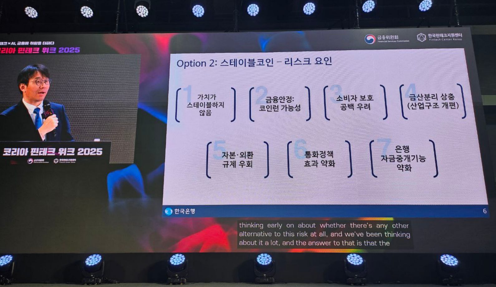 그는 “한국은행이 최근 스테이블코인의 잠재적 리스크를 언급했다는 이유로 반대한다는 오해가 있지만 기술적 필요성과 효율성에는 충분히 공감한다”며 “중앙은행의 역할은 위험 요인을 설명하고 대안을 제시하는 것”이라고 말했다.