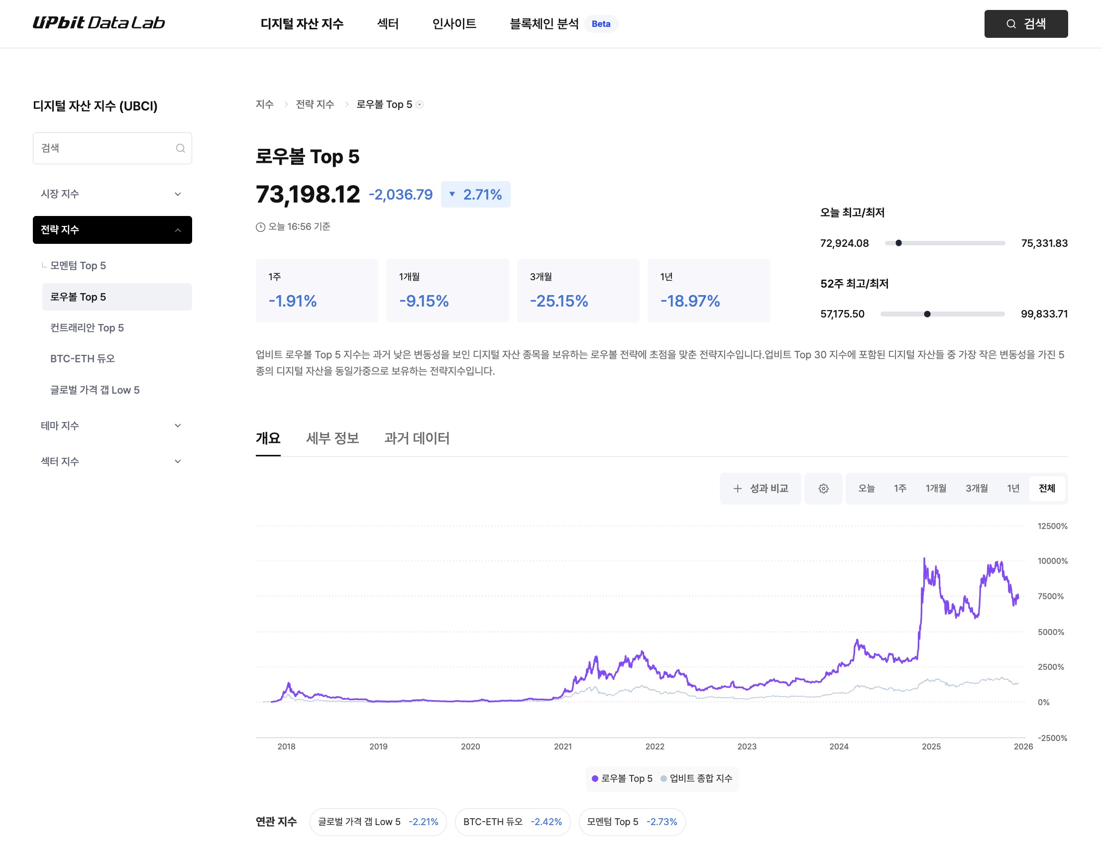 이와 함께 변동성 수준이 낮은 자산을 선별하는 ‘업비트 로우볼 Top 5 지수’도 제공하고 있다. 로우볼(Low Volatility) 지수는 업비트 원화 마켓에서 거래 지원 중인 디지털자산 가운데 시가총액 상위 30개 종목의 월 단위 변동성이 가장 낮은 5개 디지털자산을 추출해 구성한 전략 지수로, 매월 2일 오전 9시에 편입 종목 리스트가 공개된다. 투자자는 이를 통해 해당 시점에 상대적으로 변동성이 낮은 종목들을 한눈에 확인하고, 안정성을 중시하는 포트폴리오 구성 시 참고 지표로 활용할 수 있다.