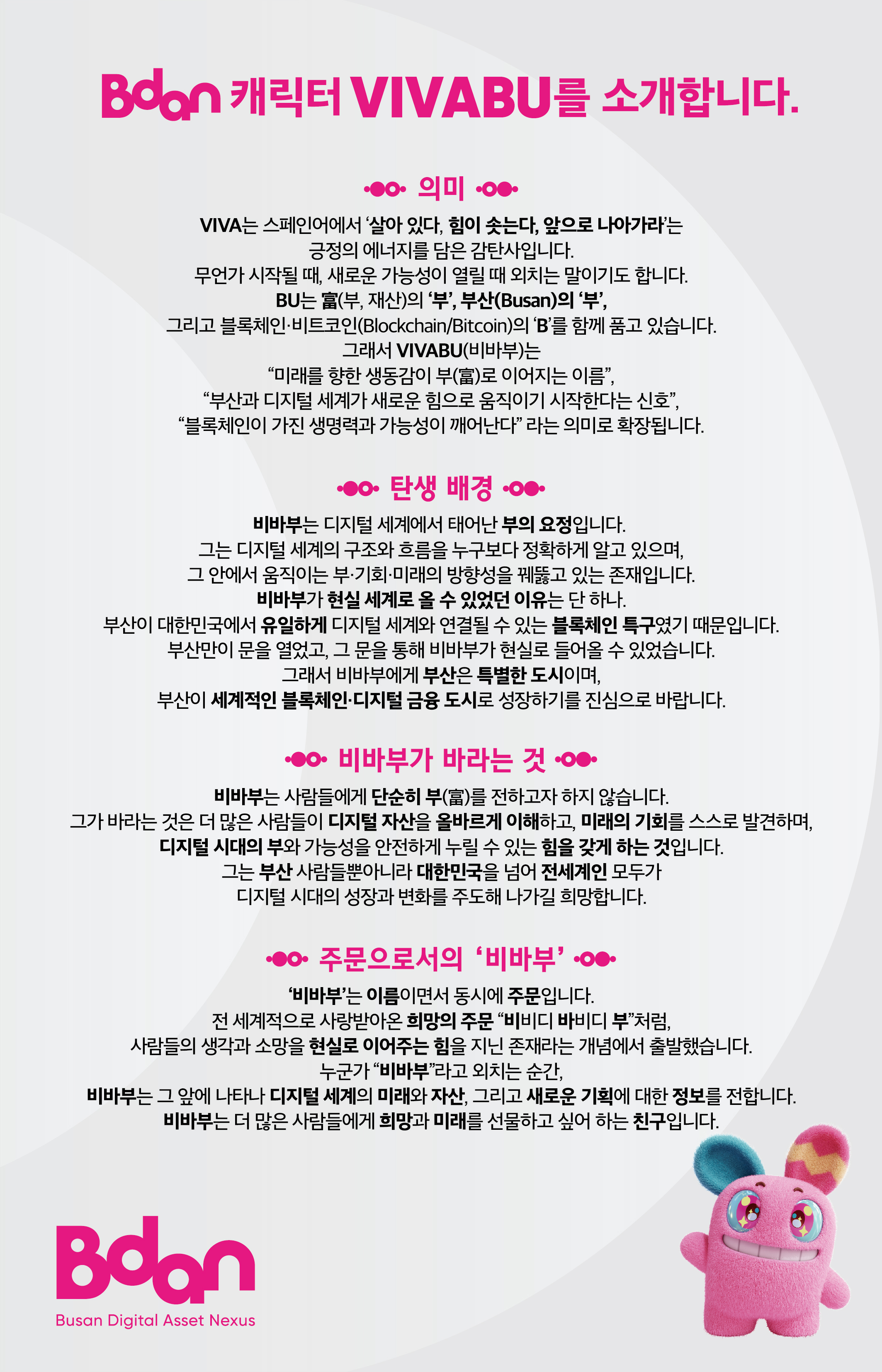 한편 부산디지털자산거래소 비단은 앞으로도 비바부를 중심으로 블록체인과 디지털금융을 보다 친근하게 전달하는 다양한 콘텐츠와 서비스를 선보이며, 부산을 기반으로 한 글로벌 블록체인 도시 비전 확산에 나설 계획이다.