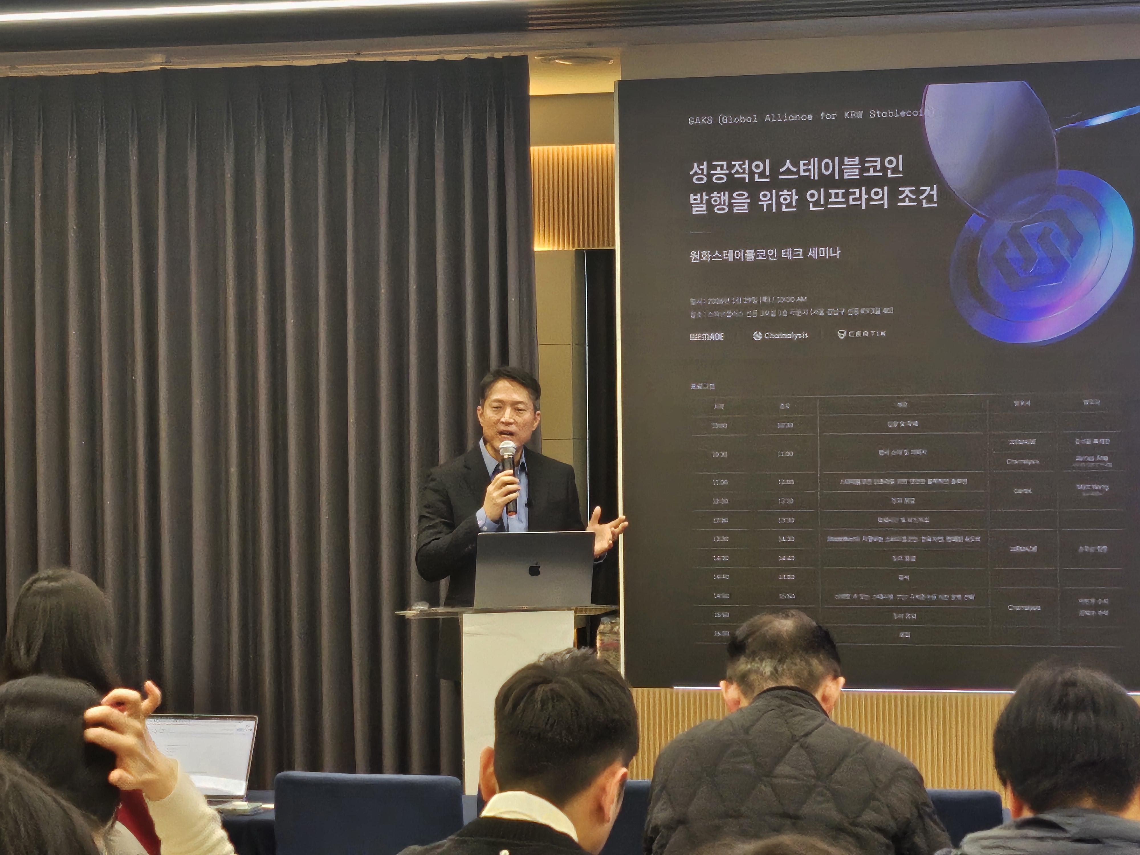 29일 위메이드는 서울 강남구 오크우드 호텔에서 글로벌 웹3 기업인 체이날리시스(Chainalysis), 서틱(CertiK)과 함께 ‘원화 스테이블코인 테크 세미나’를 개최했다. 이날 기조연설에 나선 김석환 위메이드 부사장은 상장사로서 메인넷을 운영하며 겪은 고충과 노하우를 공유하며, 전통 금융기관의 블록체인 도입을 위해서는 기존 퍼블릭 체인이 아닌 '전용 인프라'가 필수적이라고 강조했다.