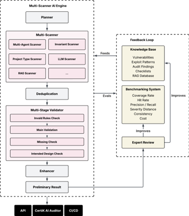 AI Auditor는 CertiK의 독자 기술인 ‘다단계 검증기(Multi-Stage Validator)’ 시스템을 기반으로 구동된다. 해당 시스템에 내장된 MultiScanner 프레임워크는 단일 AI 모델에 의존하지 않고, 여러 전문화된 스캐너를 동시에 실행하는 구조를 갖추고 있다. 초기 분석 결과가 생성된 이후, 검증기는 경보를 다중 단계로 중복 제거하고, 취약점의 ‘의미적 유효성’과 ‘실제 악용 가능성’을 교차 검증함으로써 실질적인 위협이 아닌 불필요한 정보를 걸러낸다. 그 결과 개발자에게는 실제 위험성을 지닌 핵심 보안 이슈만 선별적으로 제공된다.