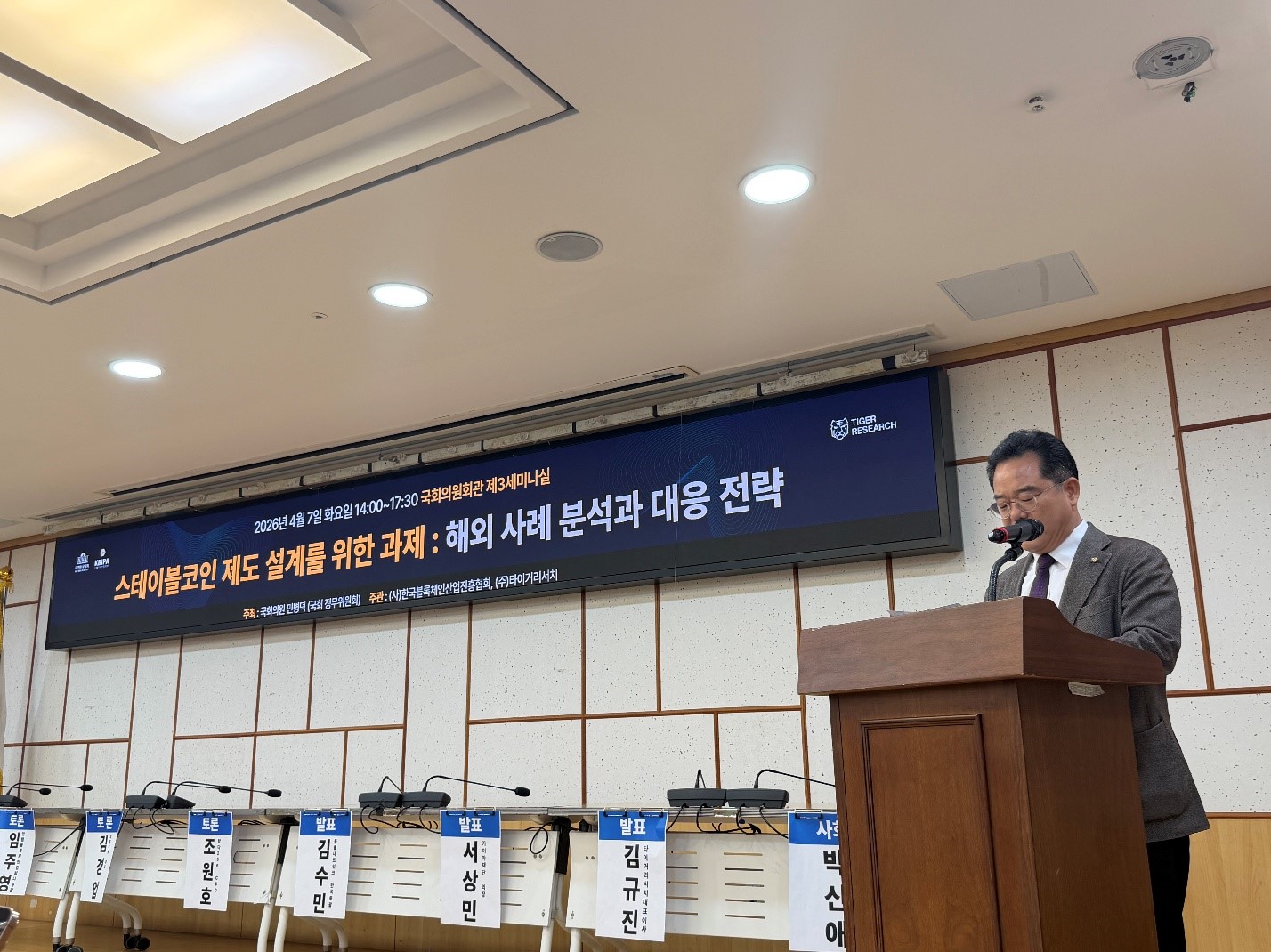 국회 정무위원회 소속 민병덕 의원실이 주최하고 (사)한국블록체인산업진흥협회(이사장 김종원, 이하 협회)와 ㈜타이거리서치가 공동 주관한 ‘스테이블코인 제도 설계를 위한 과제: 해외 사례 분석과 대응 전략’ 세미나가 7일 오후 국회의원회관 제3세미나실에서 개최되었다.
