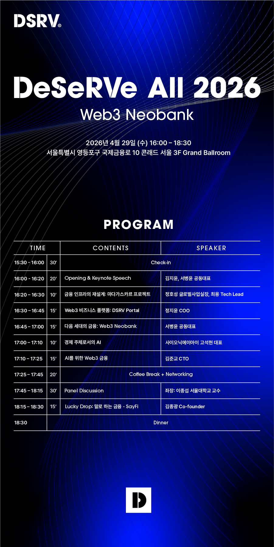 블록체인 인프라 기술 기업 DSRV(공동대표 김지윤·서병윤)는 4월 29일 서울 여의도 콘래드 호텔에서 미래 금융의 지향점을 제시하는 ‘DeSeRVe All 2026: Web3 Neobank’ 행사를 개최한다.