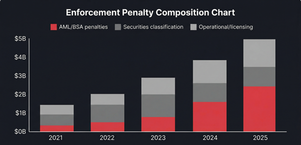보고서에 따르면 글로벌 디지털자산 규제 집행의 방향은 근본적인 전환점을 맞이했다. 2024년부터 2025년 사이 미국 증권거래위원회(SEC)의 암호화폐 분야 특별 집행 건수는 전년 대비 60% 감소했으며, 벌금 규모 역시 97% 급감했다. 반면 미국 법무부(DOJ)와 금융범죄단속네트워크(FinCEN)는 집행 공백을 메우며, 2025년 상반기에만 자금세탁방지(AML) 관련 사안으로 9억 달러 이상의 벌금 및 합의금을 부과했다.