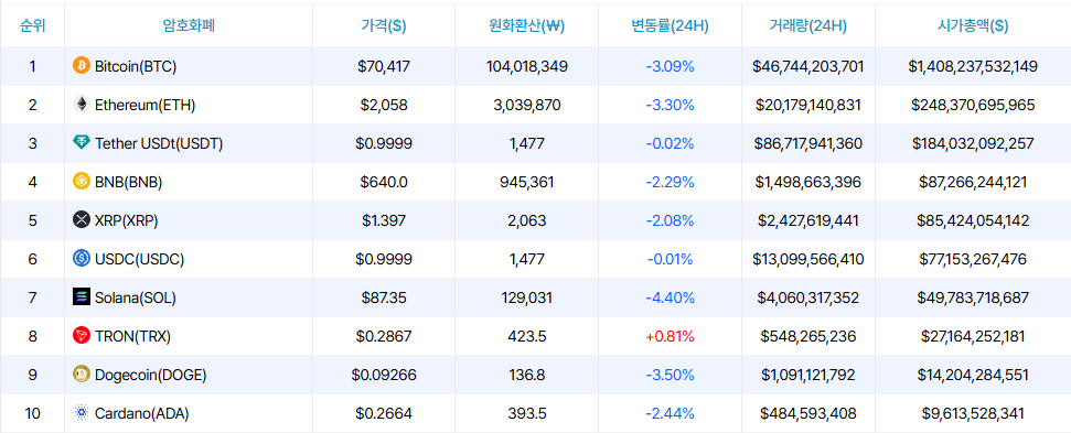 암호화폐 시장이 하락세를 보이고 있다. 토큰포스트마켓에 따르면 현재 기준 비트코인은 전날 대비 3.06% 하락한 70,819달러(약 1억410만원)에 거래되고 있다.