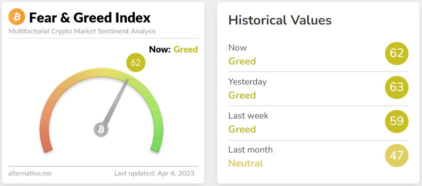 얼터너티브가 제공하는 암호화폐 공포-탐욕 지수는 4일 기준 62를 기록하며 '탐욕' 단계를 가리키고 있다.