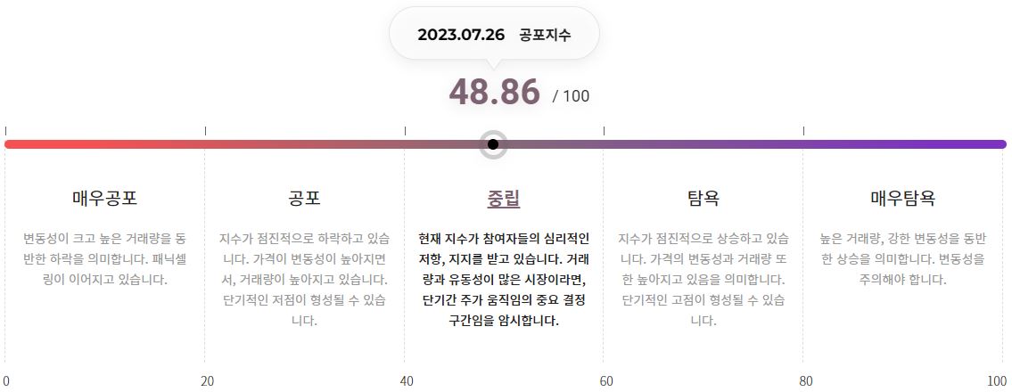 두나무가 제공하는 암호화폐 공포-탐욕 지수는 26일 기준 48.86을 기록하며 '중립' 단계를 보이고 있다.