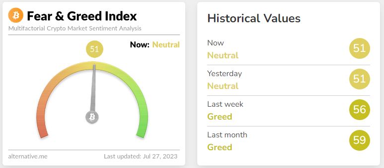 얼터너티브가 제공하는 암호화폐 공포-탐욕 지수는 27일 기준 51을 기록하며 '중립' 단계를 보이고 있다.