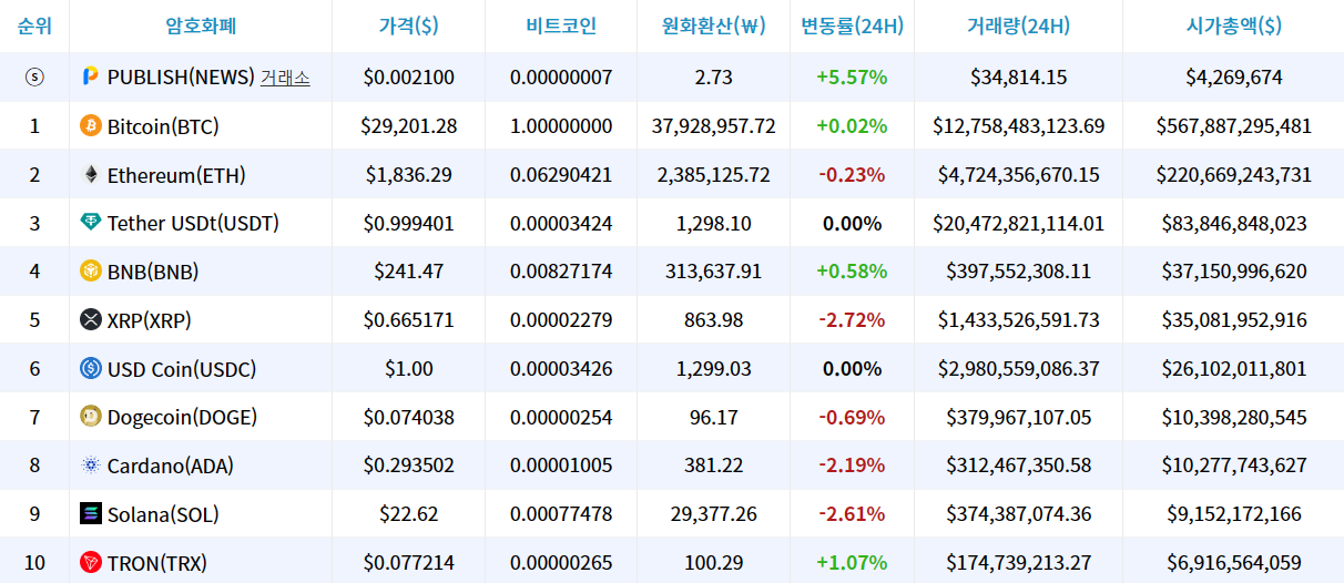 토큰포스트마켓에 따르면 4일 오전 10시 50분 기준 비트코인은 전날 대비 0.02% 상승한 2만9201 달러(한화 약 3794만원)에 거래되고 있다.