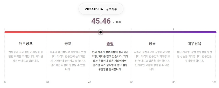 UBCI가 제공하는 가상자산 공포-탐욕 지수는 14일 기준 45.46을 기록하며 '중립' 단계를 유지하고 있다.