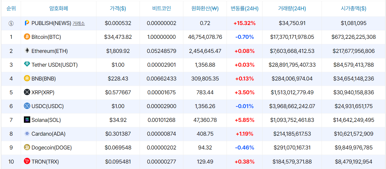 토큰포스트마켓에 따르면 31일 오전 8시 기준 비트코인은 전날 대비 0.70% 하락한 3만4473달러(한화 약 4675만원)에 거래되고 있다.