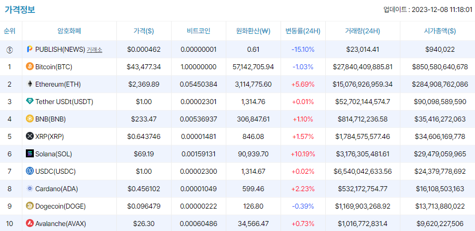 [오후 시세브리핑] 암호화폐 시장 강보합세...비트코인 4만3477달러
