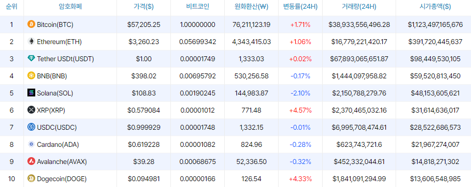시가총액 2위 이더리움은 전날 대비 1.06% 오른 3260달러(약 434만원)를 기록했다.