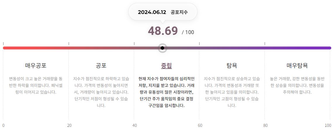 UBCI가 제공하는 디지털자산 공포-탐욕 지수는 12일 기준 48.69를 기록하며 "중립" 단계를 보이고 있다.