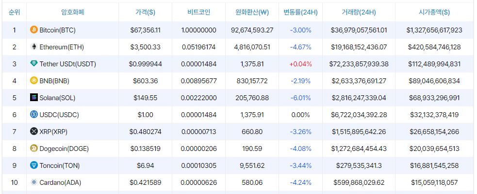 시가총액 2위 이더리움은 전날 대비 4.67% 내린 3500.33달러(약 481만원)를 기록했다.