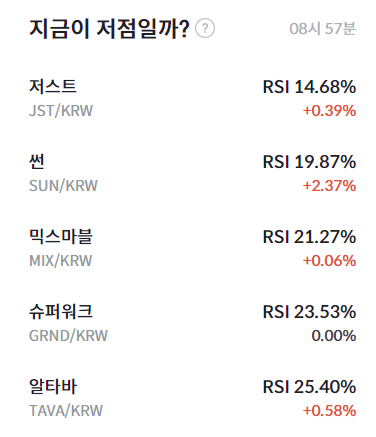 암호화폐 거래소 빗썸의 상대강도지수(RSI)에 따르면 12일 08시 42분 저스트(JST) RSI 14.68%를 기록했다.