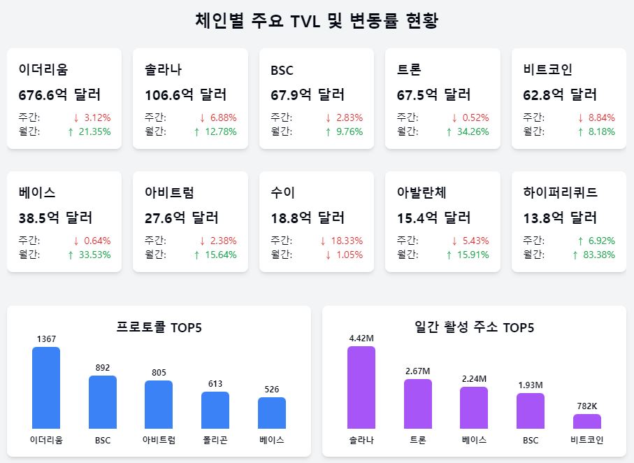 주간 기준 TVL 변화율을 보면, 대부분의 체인이 하락세를 보인 가운데 하이퍼리퀴드 L1(+6.92%)만이 상승세를 방어했다. 이외에는 ▲수이(–18.33%) ▲비트코인(–8.84%) ▲솔라나(–6.88%) ▲아발란체(–5.43%) ▲이더리움(–3.12%) 등 주요 체인이 모두 약세를 기록했다.