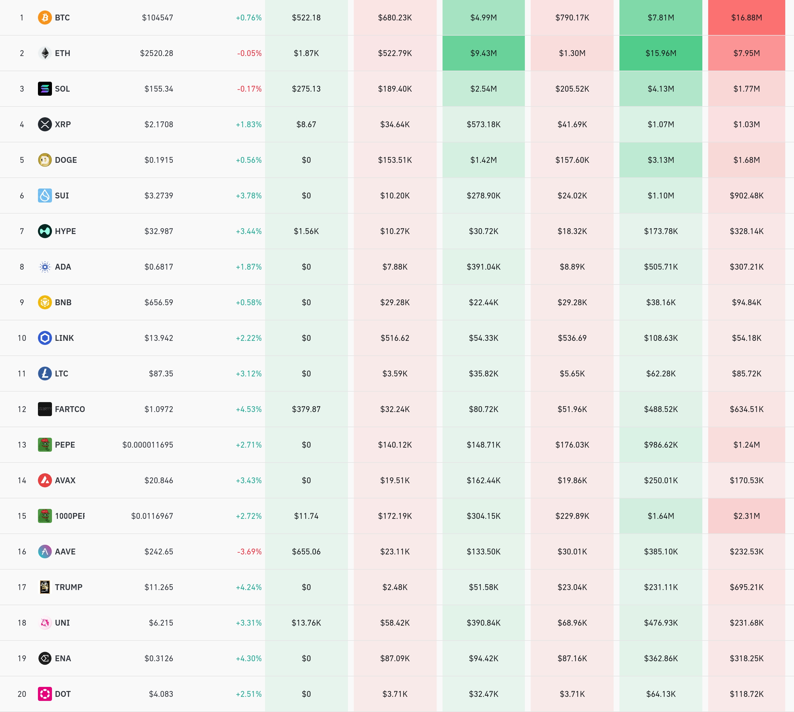 특이사항으로는 1000PEPE, PEPE, FARTCOIN 등 밈 토큰들의 청산도 두드러졌다. 특히 1000PEPE는 24시간 동안 약 395만 달러의 청산이 발생하며, 주요 코인에 버금가는 청산 규모를 기록했다.