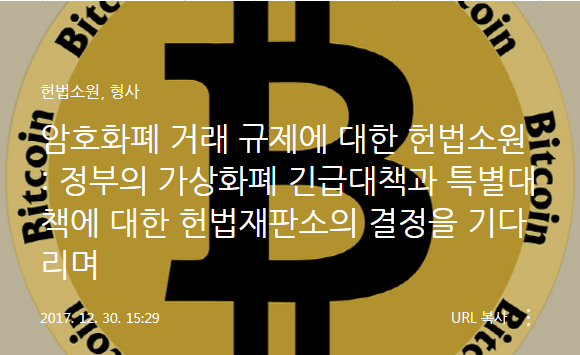 이를 두고 암호화폐 투자자, 거래소 관계자 등 347명은 2017년 12월 30일, 정부가 법률적 근거없이 국민의 기본권인 평등권과 행복추구권, 재산권을 침해했다며 헌법재판소에 헌법소원을 청구했다.