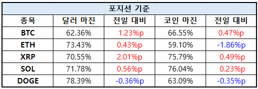 XRP는 달러 마진 70.55%로 전일 대비 2.01%p 오르며 상승했으며, 코인 마진도 75.79%로 0.49%p 늘어나며 양 구간 모두에서 매수세가 강화됐다.