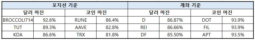 상위 트레이더 기준 종목별 포지션 비중을 살펴보면 포지션 기준으로는 달러 마진 시장에서 ▲BROCCOLI714(92.6%) ▲TUT(89.3%) ▲KDA(86.6%) 순으로 롱 비중이 높게 나타났다. 코인 마진 시장에서는 ▲RUNE(86.4%) ▲AAVE(82.8%) ▲TRX(81.8%)가 상위권에 올랐다.