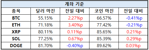 XRP는 달러 마진 80.11%로 전일 대비 0.11%p 상승했으며, 코인 마진은 85.65%로 0.21%p 늘어나며 양 구간 모두에서 상승했다.