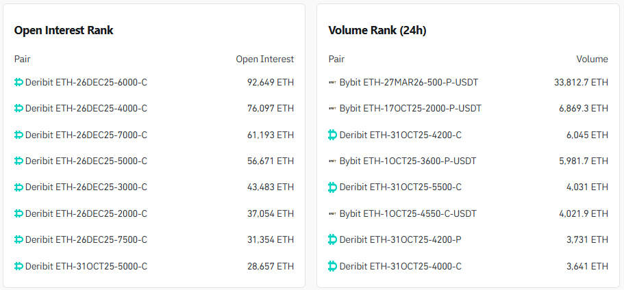 가장 많이 거래된 옵션 계약은 ▲500달러 풋옵션(3월 27일, 바이비트) ▲2000달러 풋옵션(10월 17일, 바이비트) ▲4200달러 콜옵션(10월 31일, 데리비트)이다.