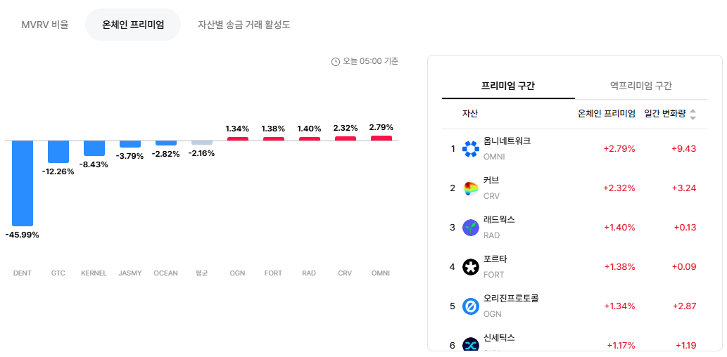 역프리미엄 구간 덴트(–45.99%)|깃코인(–12.26%)|커널다오(–8.43%)|재스미코인(–3.79%)|오션프로토콜(–2.82%)