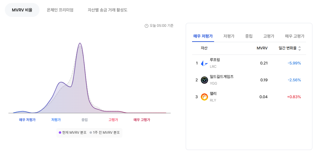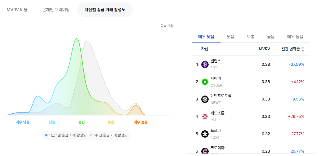 10월 1일 오전 5시 기준 업비트 데이터랩에 따르면 이더리움 기반 상장 자산 101개 중 중립 자산은 47개, 저평가 자산은 52개, 고평가 자산은 2개로 집계됐다. 전체적으로는 중립과 저평가 자산 비중이 높아 다수 종목이 적정가 이하에서 거래되는 모습이다.