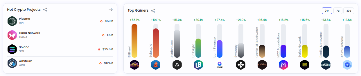 사용자 관심 기준 상위 프로젝트는 ▲플라즈마(5000만 달러) ▲하나네트워크(600만 달러) ▲솔라나(2억5600만 달러) ▲아비트럼(1억2400만 달러)로 나타났다.