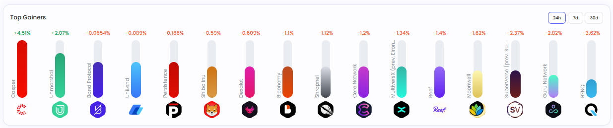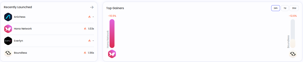 24시간 기준 등락 종목은 ▲하나네트워크(–10.5%) ▲바운들리스(–12.6%)로 집계됐다.