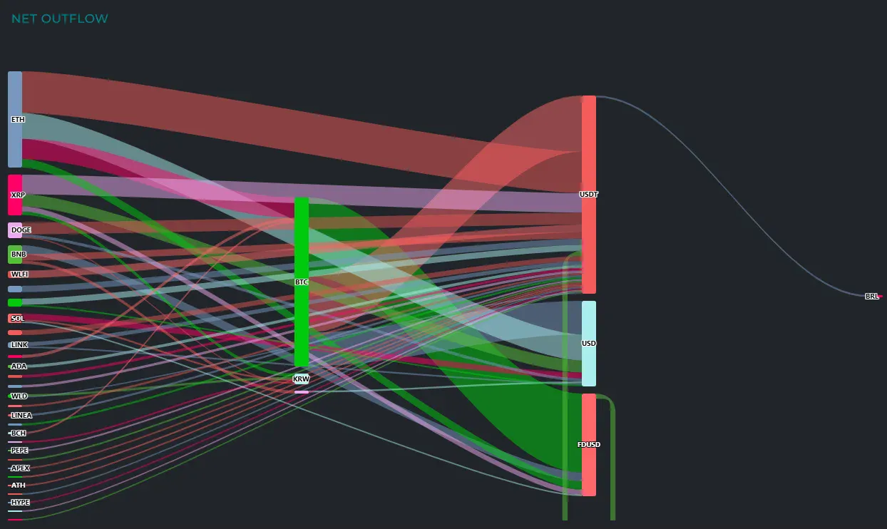 BNB는 4020만 달러가 유출돼 ▲FDUSD(1910만 달러) ▲USDT(1450만 달러) ▲USDC(650만 달러)로 분산됐고 DOGE에서는 3490만 달러가 ▲USD(2590만 달러) ▲USDT(630만 달러) ▲KRW(260만 달러)로 빠져나갔다.