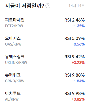 이 외에도 오아시스(OAS), 유엑스링크(UXLINK), 슈퍼워크(GRND), 아치루트(AL) 등이 RSI 30 이하의 과매도 구간에 머물고 있다. 특히 피르마체인(2.46%)은 5% 이하의 매우 낮은 수치를 기록하며 단기 매수세 유입 가능성이 주목된다.