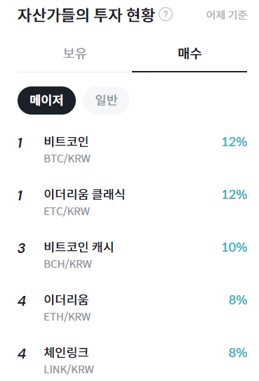 빗썸 집계에 따르면 비트코인과 이더리움 클래식이 각각 12%로 공동 1위를 기록했으며, 비트코인 캐시는 10%를 기록했다. 이어 이더리움과 체인링크가 각각 8%를 기록하며 상위권에 포함됐다.