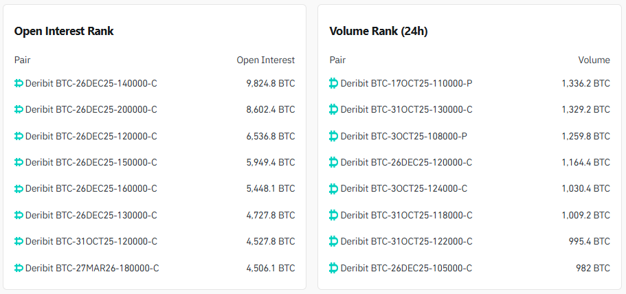가장 많이 거래된 옵션 계약은 ▲11만 달러 풋옵션(10월 17일) ▲13만 달러 콜옵션(10월 31일) ▲10만8000달러 풋옵션(10월 30일)이다.