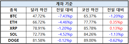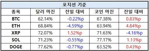 XRP는 달러 마진 78.91%로 전일 대비 1.20%p 줄었으나, 코인 마진은 85.78%로 0.13%p 증가하며 구간별 상반된 흐름을 나타냈다.