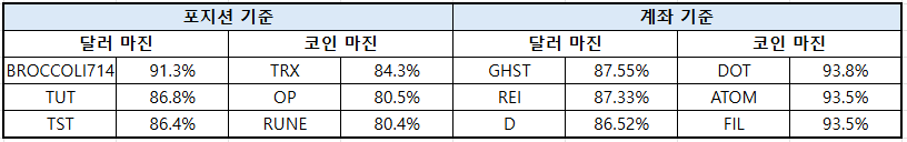상위 트레이더 기준 종목별 포지션 비중을 살펴보면 포지션 기준으로는 달러 마진 시장에서 ▲BROCCOLI714(91.3%) ▲TUT(86.8%) ▲TST(86.4%) 순으로 롱 비중이 높게 나타났다. 코인 마진 시장에서는 ▲TRX(84.3%) ▲OP(80.5%) ▲RUNE(80.4%)가 상위권에 올랐다.
