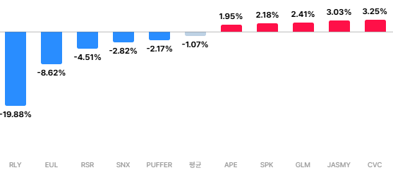 역프리미엄 구간 랠리(–19.88%)|이율파이낸스(–8.62%)|리저브라이트(–4.51%)|신세틱스(–2.82%)|퍼퍼(–2.17%)