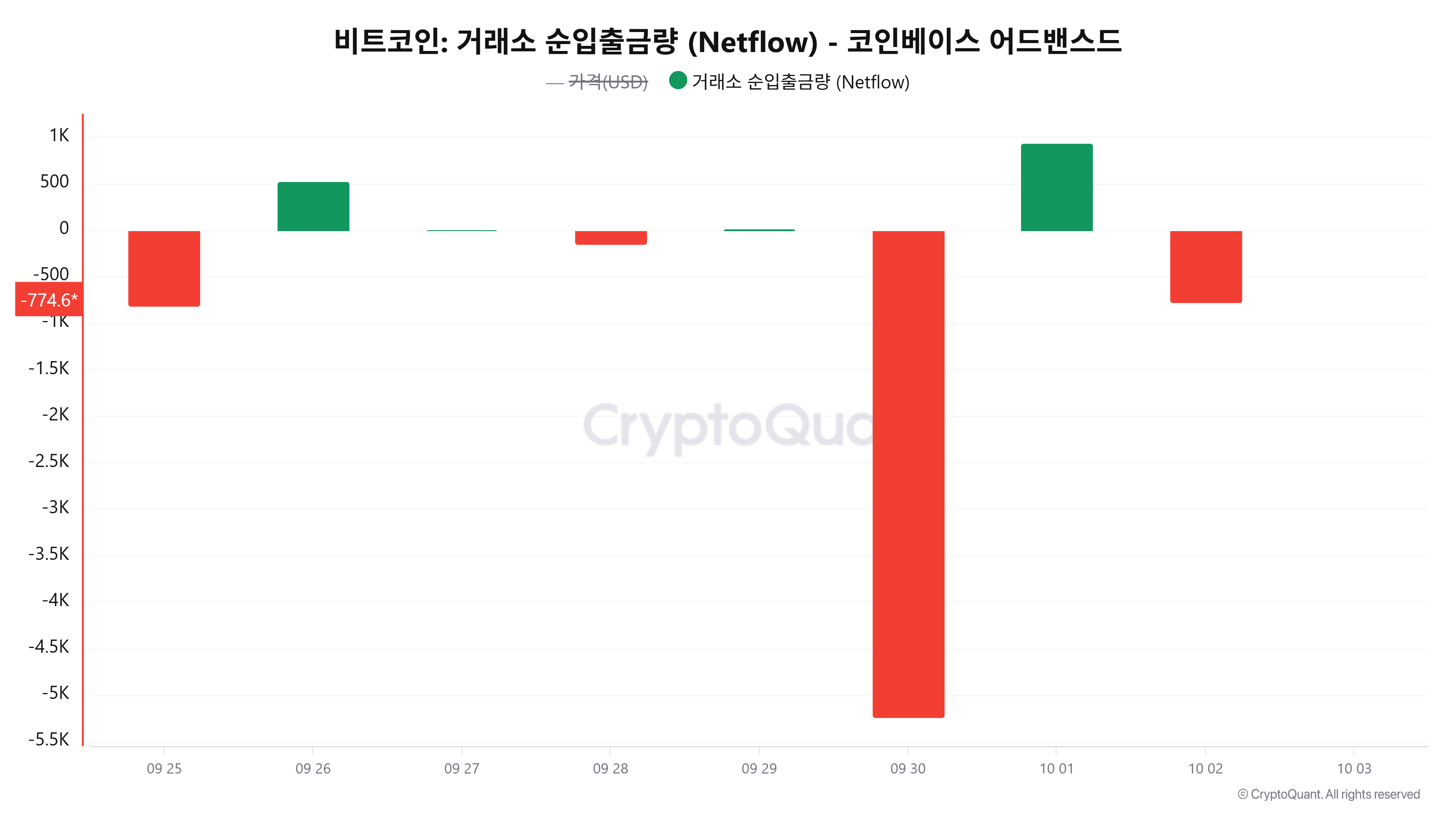 지난 5일간 흐름을 보면 ▲9월 28일 –148BTC 순유출 ▲29일 13BTC 순유입 ▲30일 –5,242BTC 순유출 ▲10월 1일 939BTC 순유입 ▲10월 2일 –775BTC 순유출이 이어졌다.
