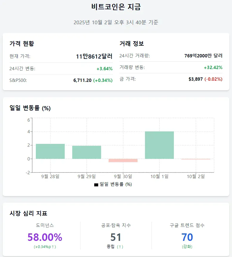 가격 11만8612달러 (+3.64%) 비트코인은 전일 대비 3.64% 상승한 11만8612달러에 거래되며 단기 반등 흐름을 이어갔다.