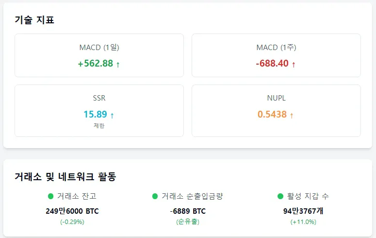 MACD +562.88 단기 MACD(1일)는 +562.88로 플러스 기조를 이어갔으나 1주 기준은 –688.40으로 여전히 약세 흐름을 유지했다.