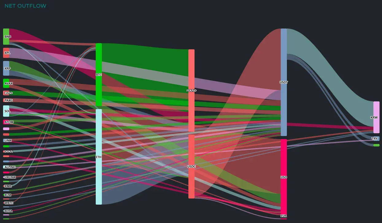 XRP에서는 총 2510만 달러가 유출돼 ▲USD(1610만 달러) ▲FDUSD(900만 달러)로 이동했다. 솔라나(SOL)에서는 총 1950만 달러가 ▲FDUSD(520만 달러) ▲원화(520만 달러) ▲달러(520만 달러) ▲ETH(260만 달러) ▲BTC(150만 달러)로 고르게 분산됐다.