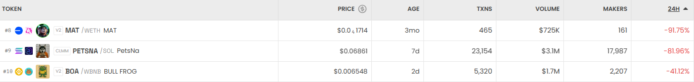 반면 가장 크게 하락한 거래쌍은 91.75% 하락한 MAT/WETH (MAT) 였다. 이어 PETSNA/SOL (PetsNa) 가 81.96%, BOA/WBNB (Bull Frog) 가 41.12% 떨어졌다.