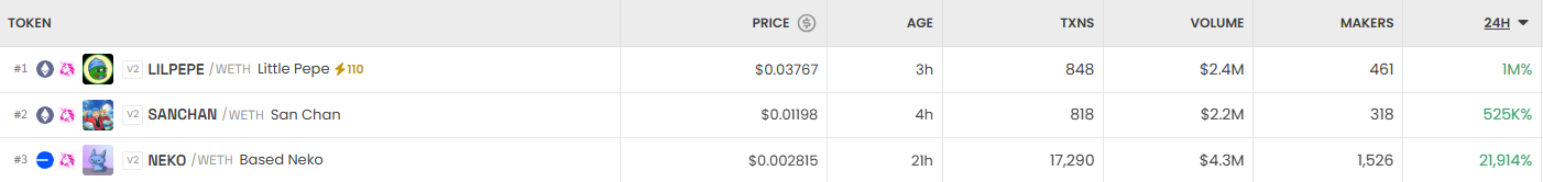 하루 동안 DEX에서 가장 크게 오른 거래쌍은 1M% 급등한 LILPEPE/WETH (Little Pepe) 였다. 이어 SANCHAN/WETH (San Chan) 이 525K%, NEKO/WETH (Based Neko) 가 21,914% 상승했다.
