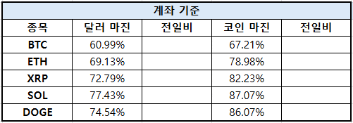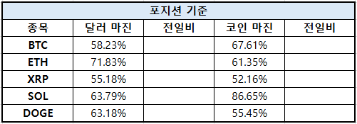 솔라나는 달러 마진이 63.79%로 8%p 가까이 줄었지만 코인 마진은 86.65%로 10%p 가량 롱 포지션 확대가 나타났다. 도지코인은 달러 마진 63.18%, 코인 마진 55.45%로, 각각 15%p, 7%p의 큰 조정을 겪었다.